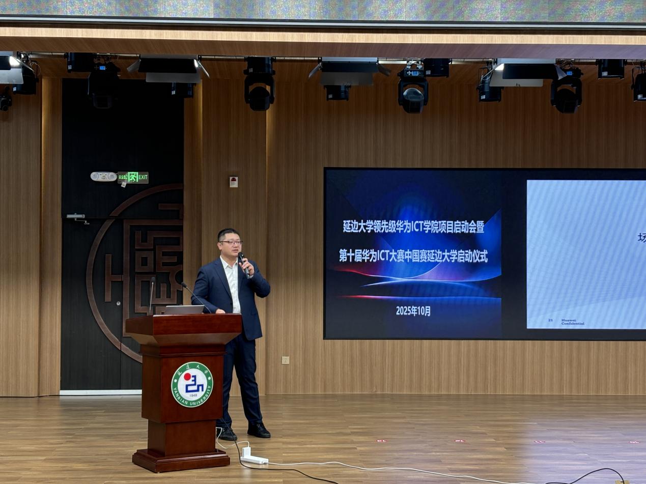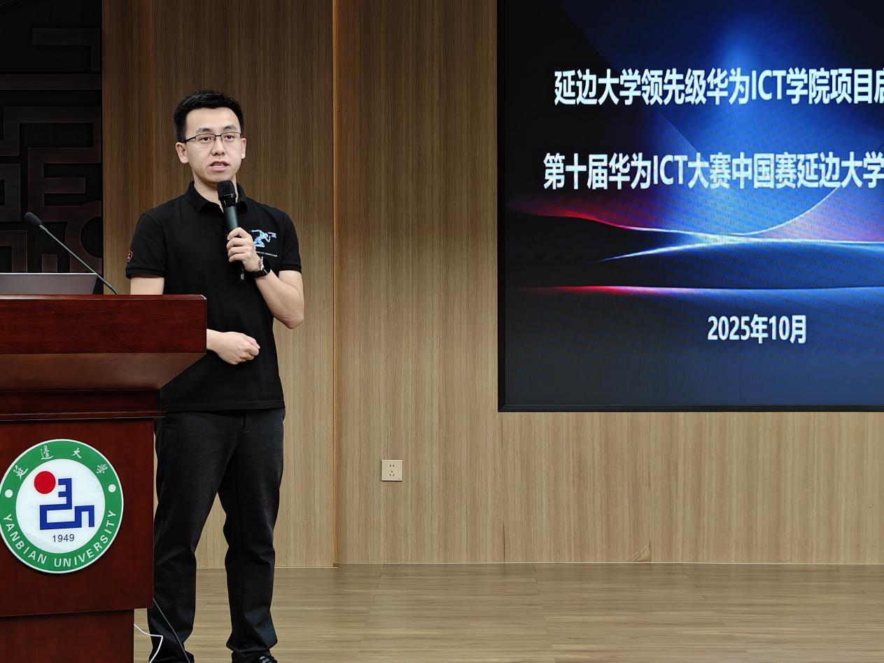随后,张旺详细介绍了华为ICT大赛的背景、赛制特点及参赛计划,鼓励学生积极参赛,在实战中检验学习成果、提升创新实践能力。会议现场举行了延边大学“领先级ICT学院项目”启动会暨第十届华为ICT大赛中国赛延边大学启动仪式,推动了我院产教融合与创新人才培养工作的深入开展,为信息技术领域高素质应用型人才的培养提供了有力支撑。