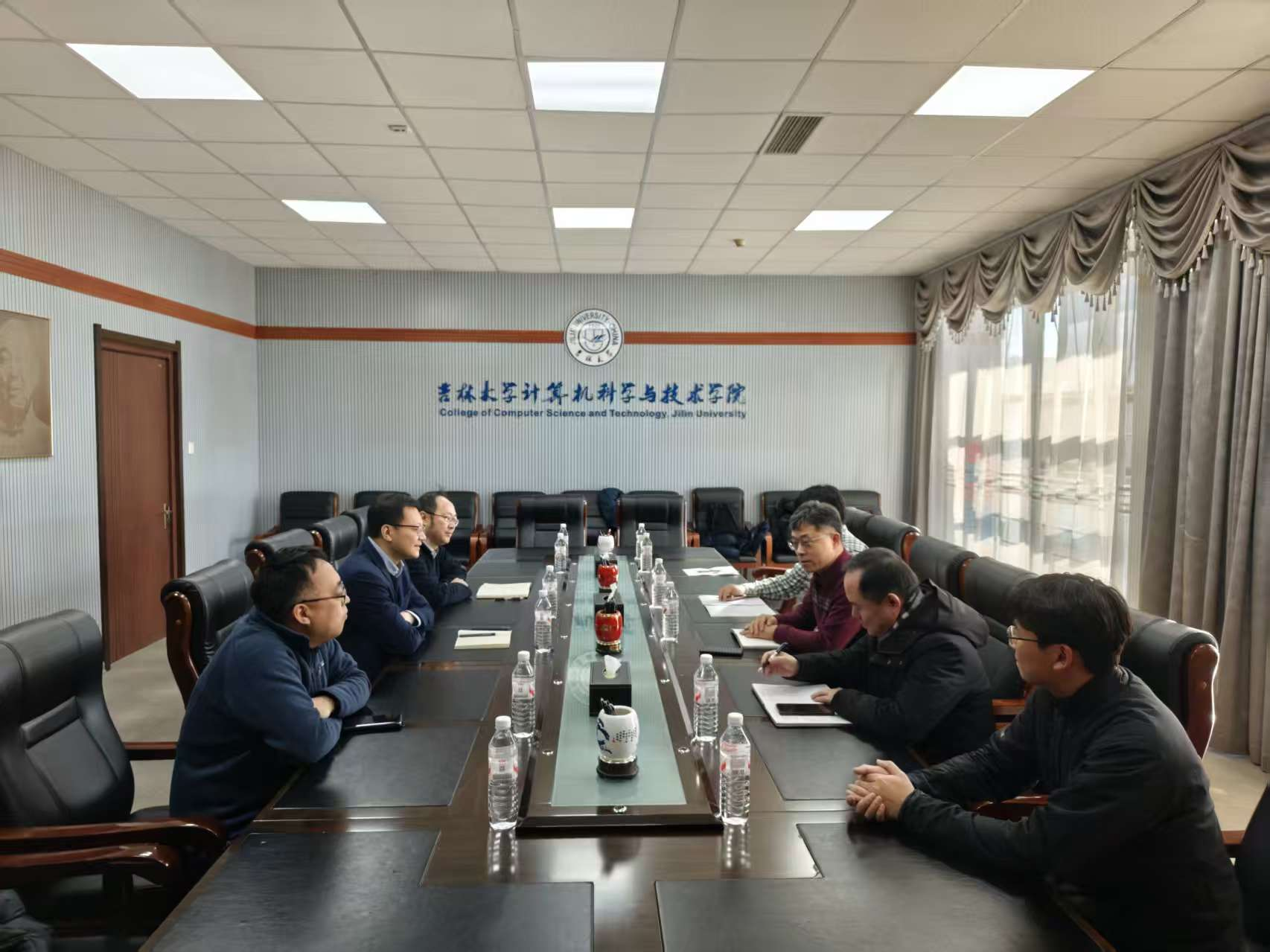 为贯彻落实国家基础学科振兴战略和“双一流”建设部署,深化校际学科合作与资源共享,2026年2月3日,延边大学工学院院长李德、研究生院副院长金明浩、工学院副院长朴锦春、许一虎及计算机科学与技术专业主任金国哲一行赴吉林大学计算机科学与技术学院开展对口支援交流。吉林大学计算机科学与技术学院院长杨博、副院长张永刚、王喆出席座谈会,双方围绕学科建设与协同发展等事宜进行了深入交流。