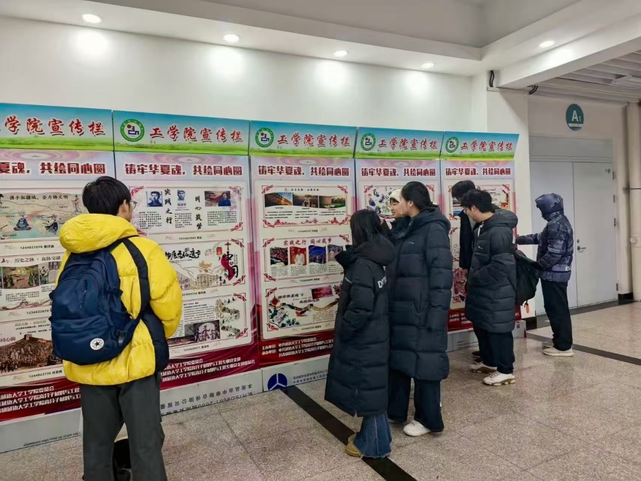 在活动筹备阶段,高分子材料与工程专业的同学们将专业素养与家国情怀有机融合,以视觉艺术为媒介,用设计诠释青年担当,以创意传递理想信念。活动涵盖策划、设计、布展与颁奖等环节,全面展现了同学们对中华民族大家庭的深厚情感与时代责任感。展览期间,学院组织了集体观展与互动交流活动。通过现场讲解与观众评议,进一步将爱国主义教育与集体荣誉感培养有机融合,有效拓展了学生综合素质培养的途径与载体。