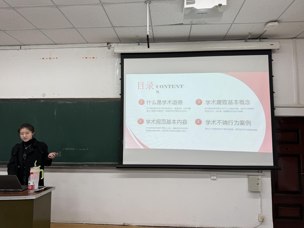曹博雯结合自身的学习经验,从学术道德的内涵、学术不端行为的危害、科研数据的处理等多个维度,进行了系统的讲解。她通过剖析国内外典型的学术不端案例,揭示了学术失范行为对个人学术声誉和职业生涯的损害。她提醒同学们,在科研过程中要时刻保持对学术的敬畏之心,坚决杜绝抄袭、剽窃、篡改数据和不当署名等任何形式的学术不端行为,做到独立研究、诚实署名和规范引用。
