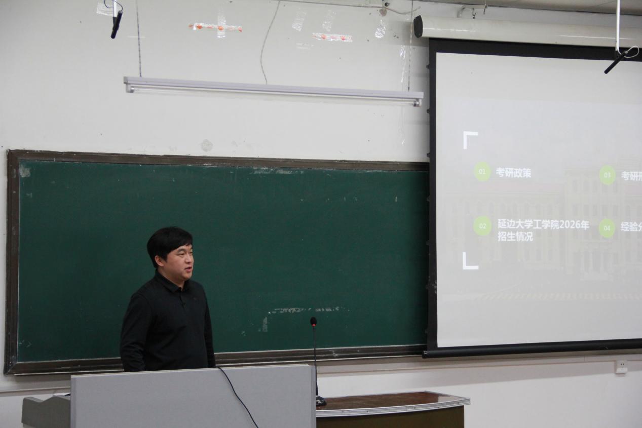2025年11月26日,延边大学工学院在3212教室举办2026届毕业生考研动员答疑会。工学院副院长朴锦春出席本次活动,大会由工学院团委书记蒋君豪主持。