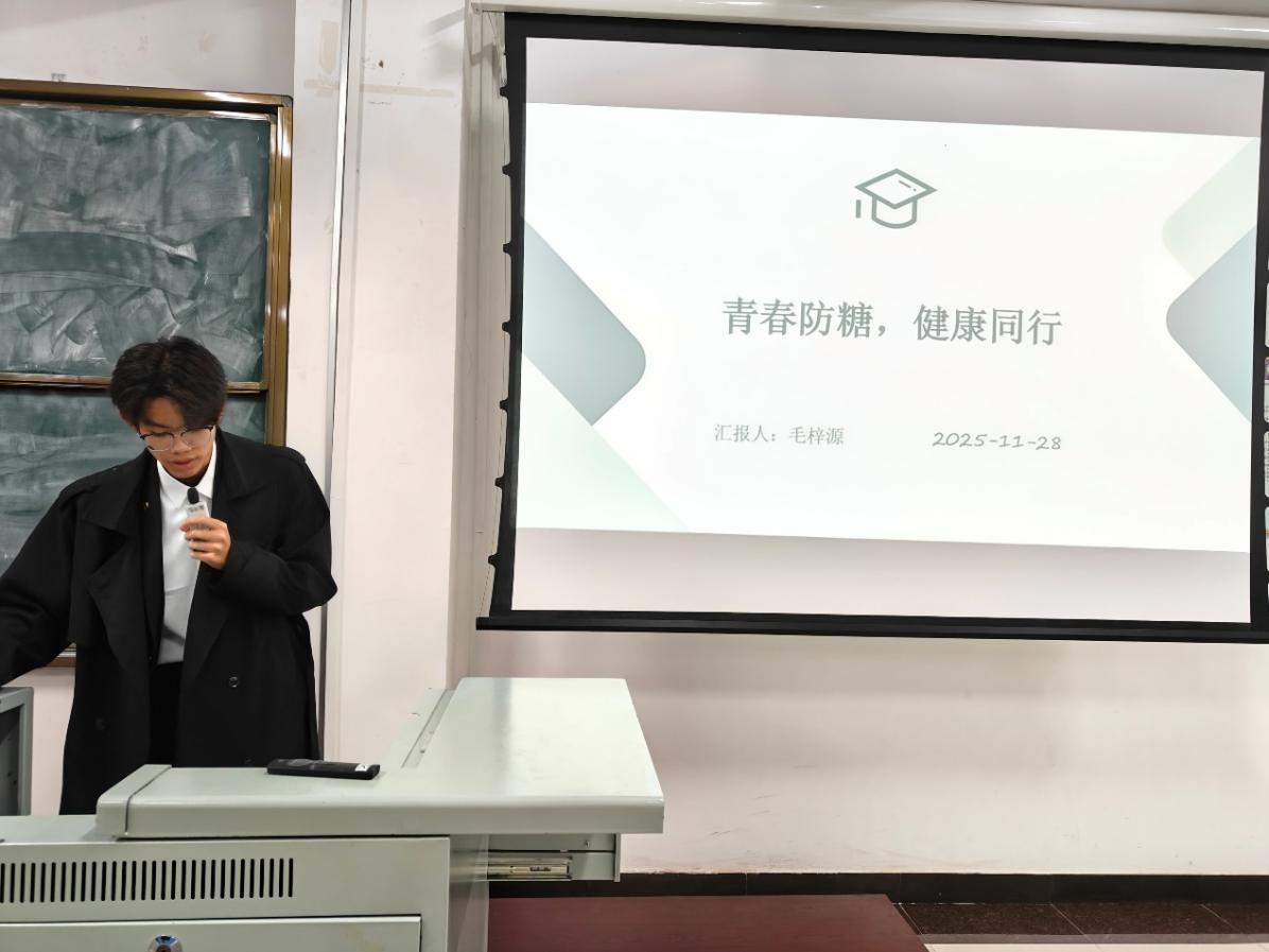 活动现场,服务团成员赵心铭、毛梓源以直观的可视化图表,揭示了可乐、雪碧、奶茶等常见饮品中的惊人含糖量,让同学们意识到“快乐水”背后潜藏的健康隐患。他们系统讲解了长期高糖饮食引发的多重健康问题:频繁口渴多尿、易饥乏力、皮肤异常、体重失控及龋齿风险等,提醒同学们警惕身体发出的“控糖警报”。同时,结合血糖正常参考值科普,重点分享了日常控糖实用技巧,包括选择低糖饮品、控制精制碳水摄入、增加膳食纤维等科学方法。