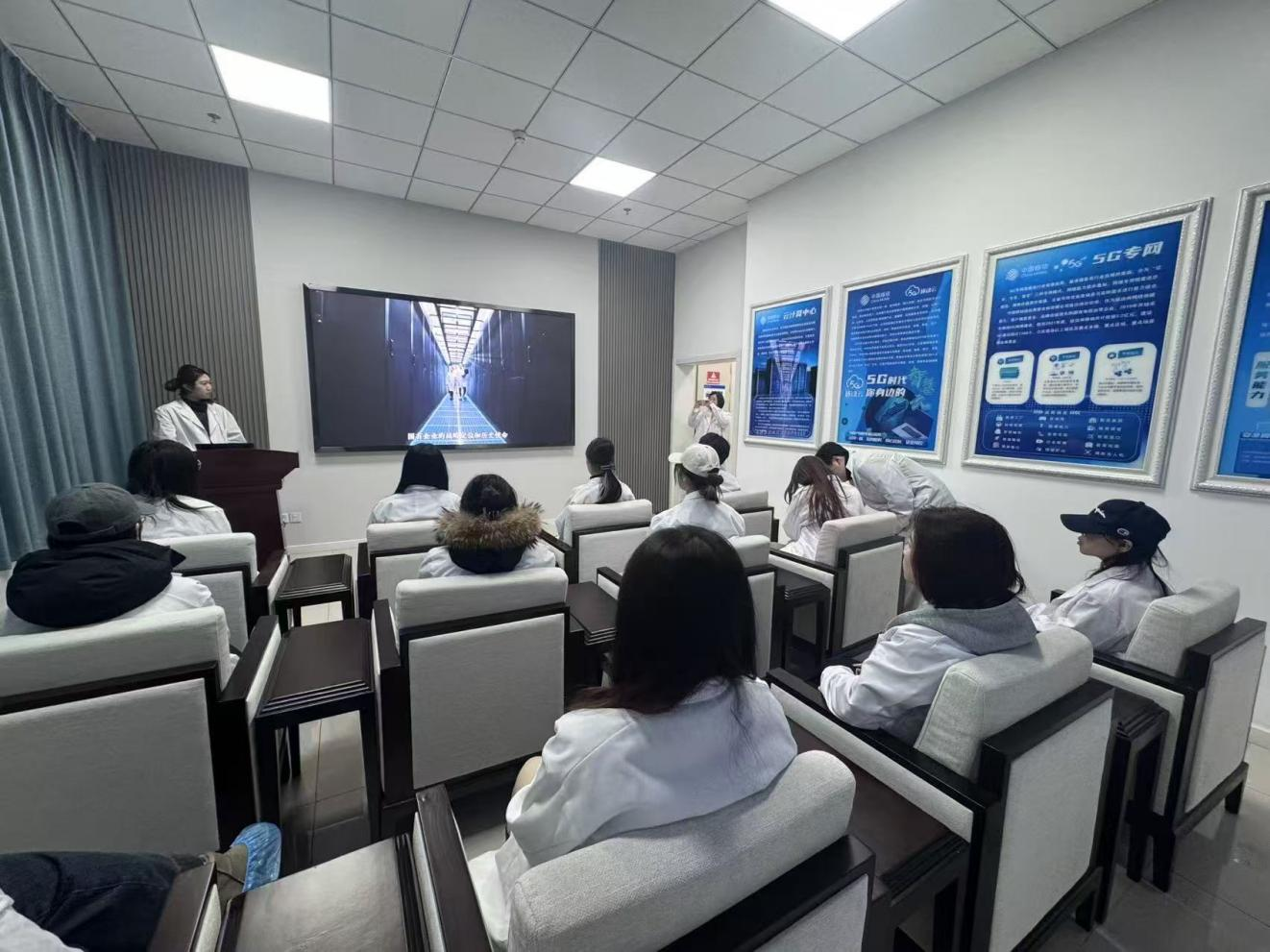 活动伊始,同学们观看了中国移动延边州分公司云计算中心的宣传视频。视频重点介绍了公司规模、网络覆盖、云计算中心的设施保障、核心服务优势及相关合作成果。随后,在工作人员的带领下,同学们有序参观了数据中心机房。工作人员详细介绍了机房在数据存储、计算承载与业务保障中的核心作用,并讲解了其物理安防、防灾系统及全方位环境监控等多重保障措施。最后,学生们走进中国移动后台办公区,亲身感受企业工作氛围与文化,进一步了解了通信企业的组织架构、岗位职责与人才发展路径。